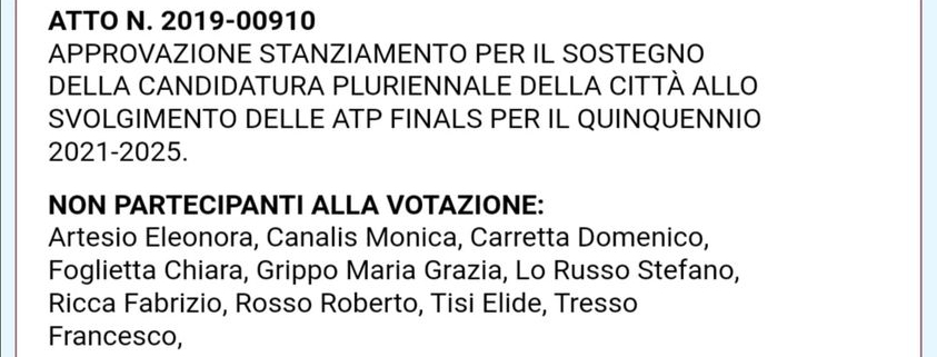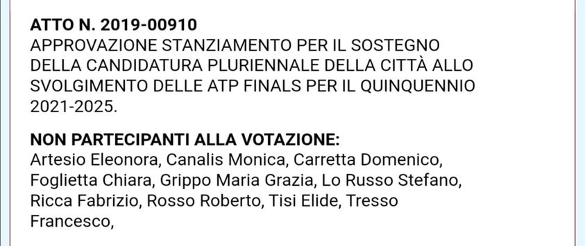 Ad integrazione del post di ieri, pubblico qui i nomi dei consiglieri che approvarono lo stanziamento economico per il sostegno della candidatura della Città ad ospitare le ATP Finals di Tennis.