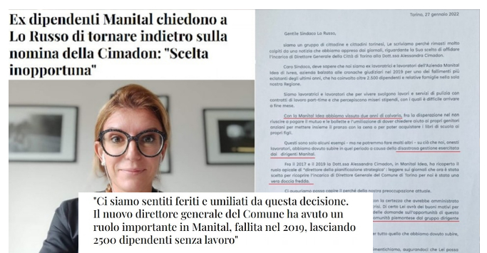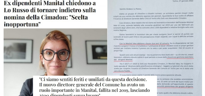 Dopo i dubbi che avevo sollevato qualche giorno fa, adesso anche gli ex dipendenti rilevano l’inopportunità della nomina di Alessandra Cimadom a direttore Generale del Comune di Torino, che “.. ha avuto un ruolo apicale in Manital Idea, fallita nel 2019, lasciando 2500 dipendenti senza lavoro”. La nomina viene da loro definita “una doccia fredda”.